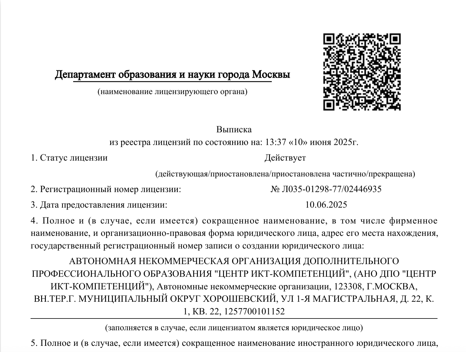 10 июня 2025 года АНО ДПО «Центр ИКТ-Компетенций» получила лицензию Департамента образования и науки города Москвы на право осуществления образовательной деятельности в сфере дополнительного профессионального образования. Данный документ подтверждает нашу квалификацию и даёт старт новым перспективным проектам.
